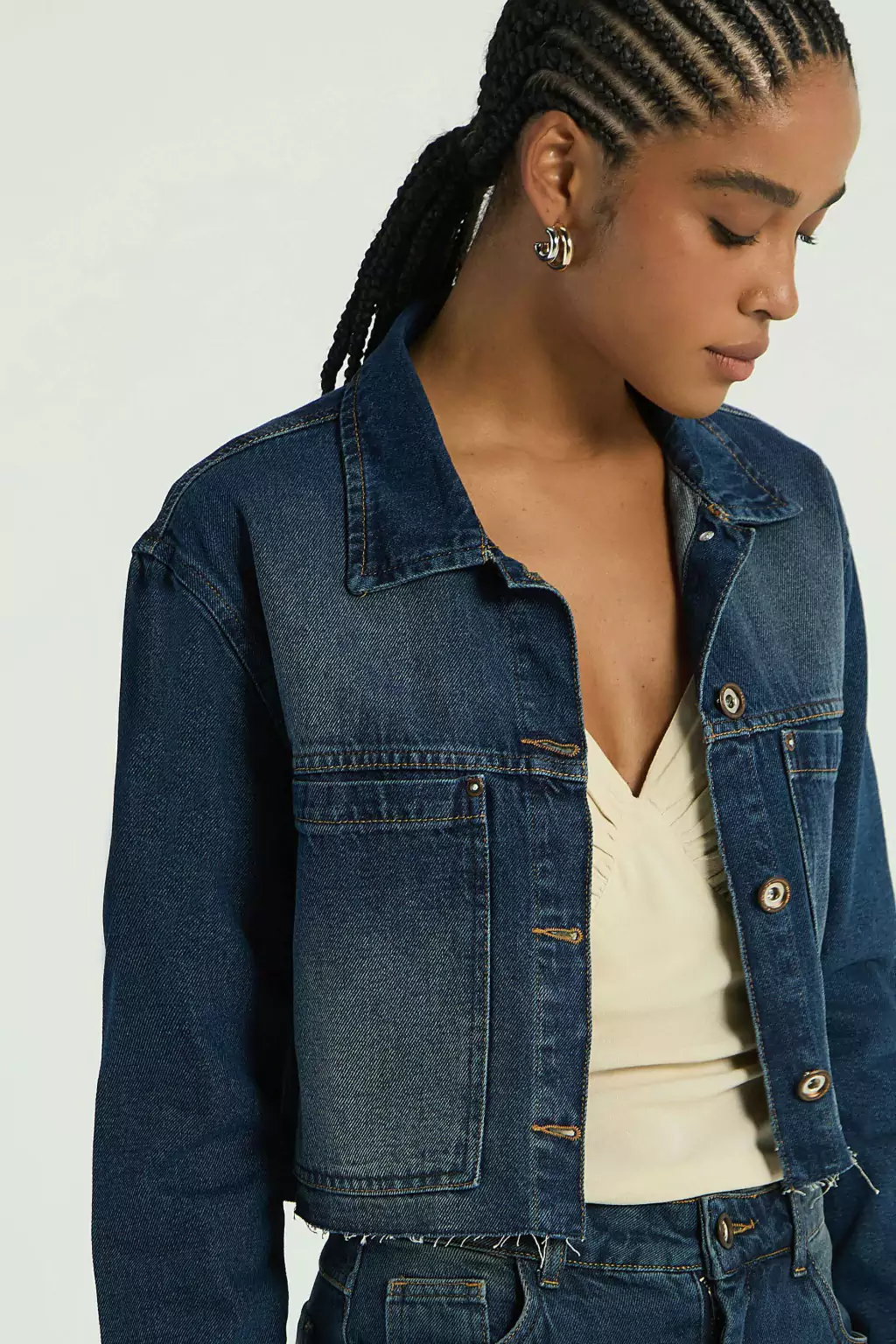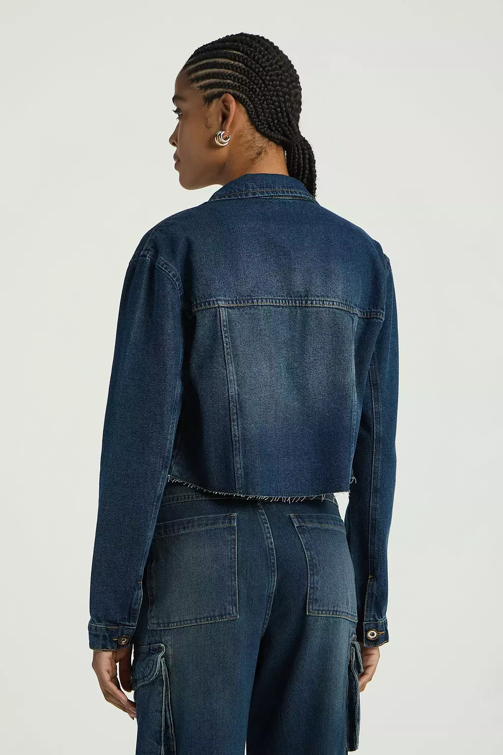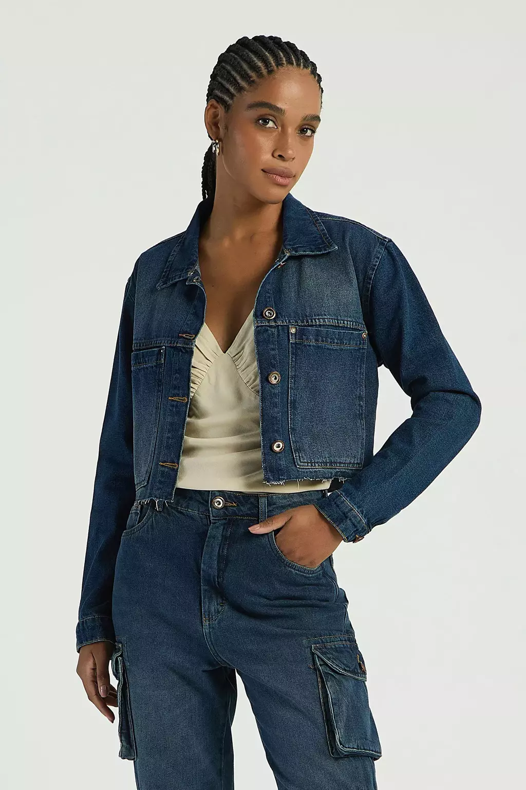 A Jaqueta jeans possui mangas longas, maxi bolsos, abotoamento frontal para fechamento e barra com detalhes desfiados. Perfeito para usar com croppeds, destacando um estilo jovem e atual.