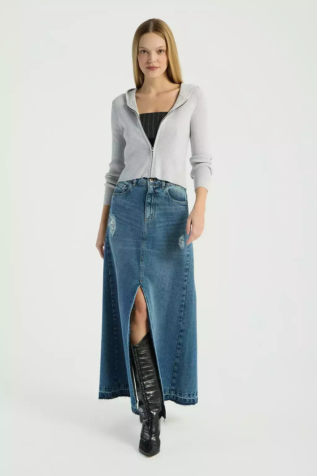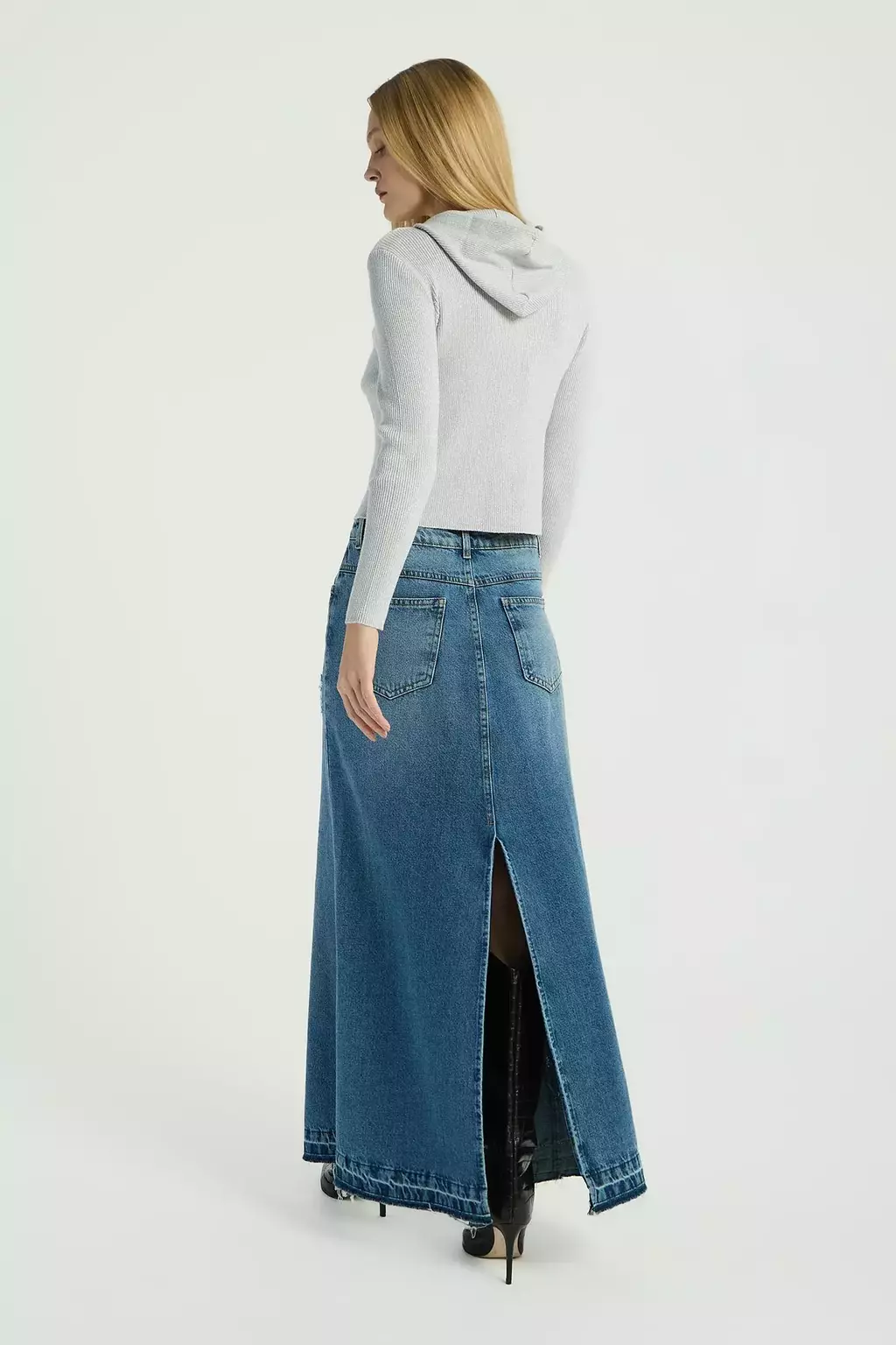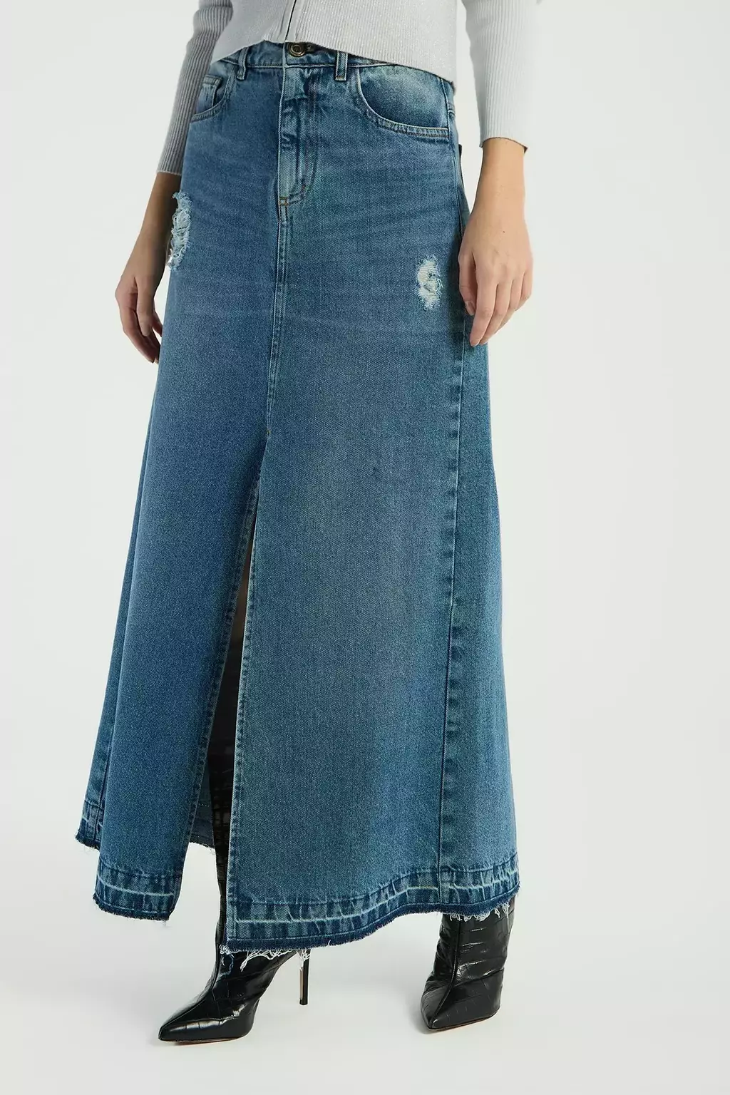 A Saia jeans apresenta comprimento longo, bolsos laterais e traseiros, fenda frontal e traseira na barra e detalhes poídos frontais. A peça-chave para um visual moderno e cheio de personalidade.