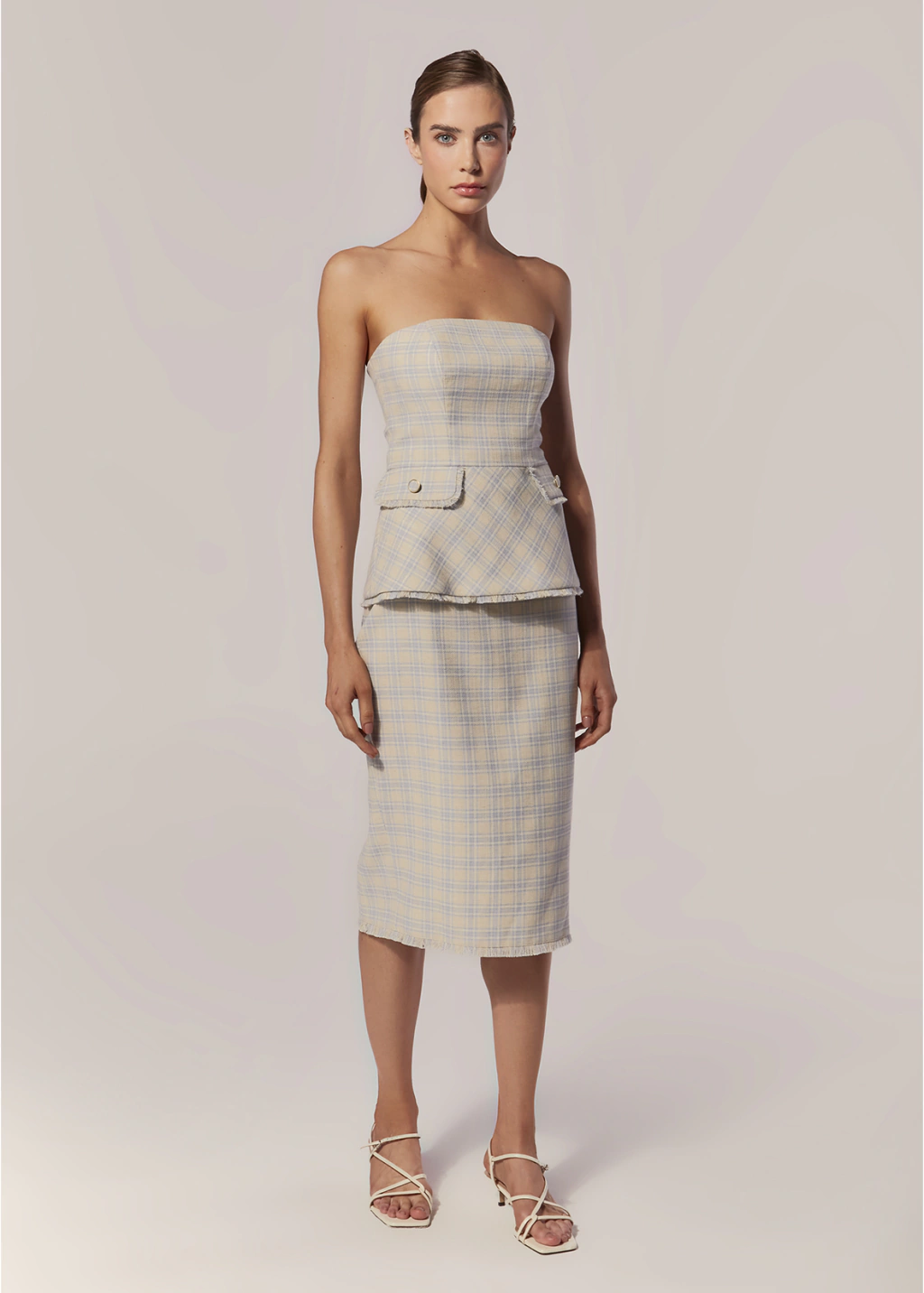 Top tomara que caia alfaiataria ecos – Design de Excelência e Sofisticação. O Top Tomara que Caia Alfaiataria Ecos, na estampa xadrez e cor azul em tom pastel, apresenta o modelo clássico de forma elegante com bolsos ocultos nas laterais, busto estruturado e cintura demarcada. A modelagem eleva a silhueta e valoriza cada detalhe do corpo. Combine com saias midi e sandálias finas para uma produção ainda mais elegante.