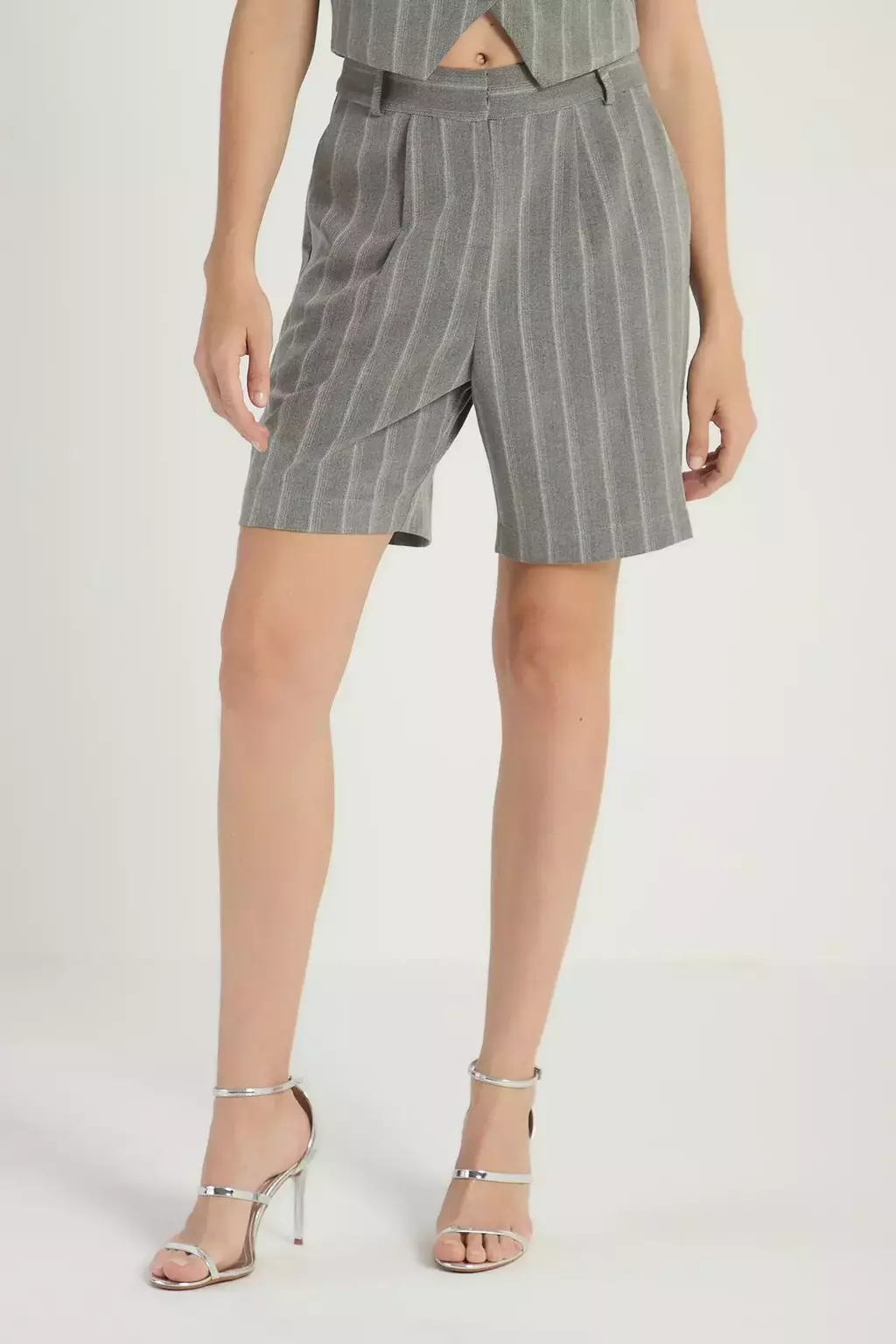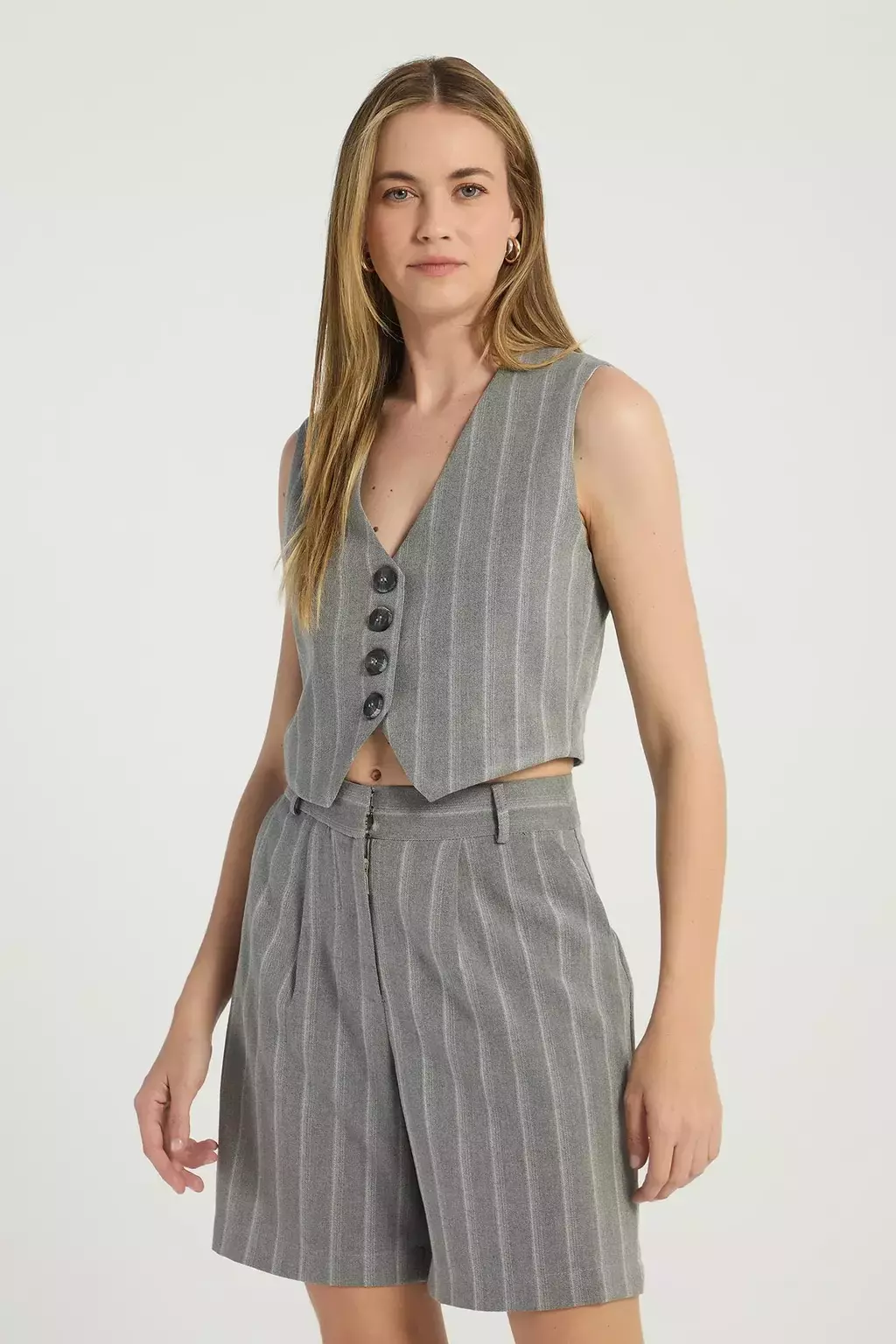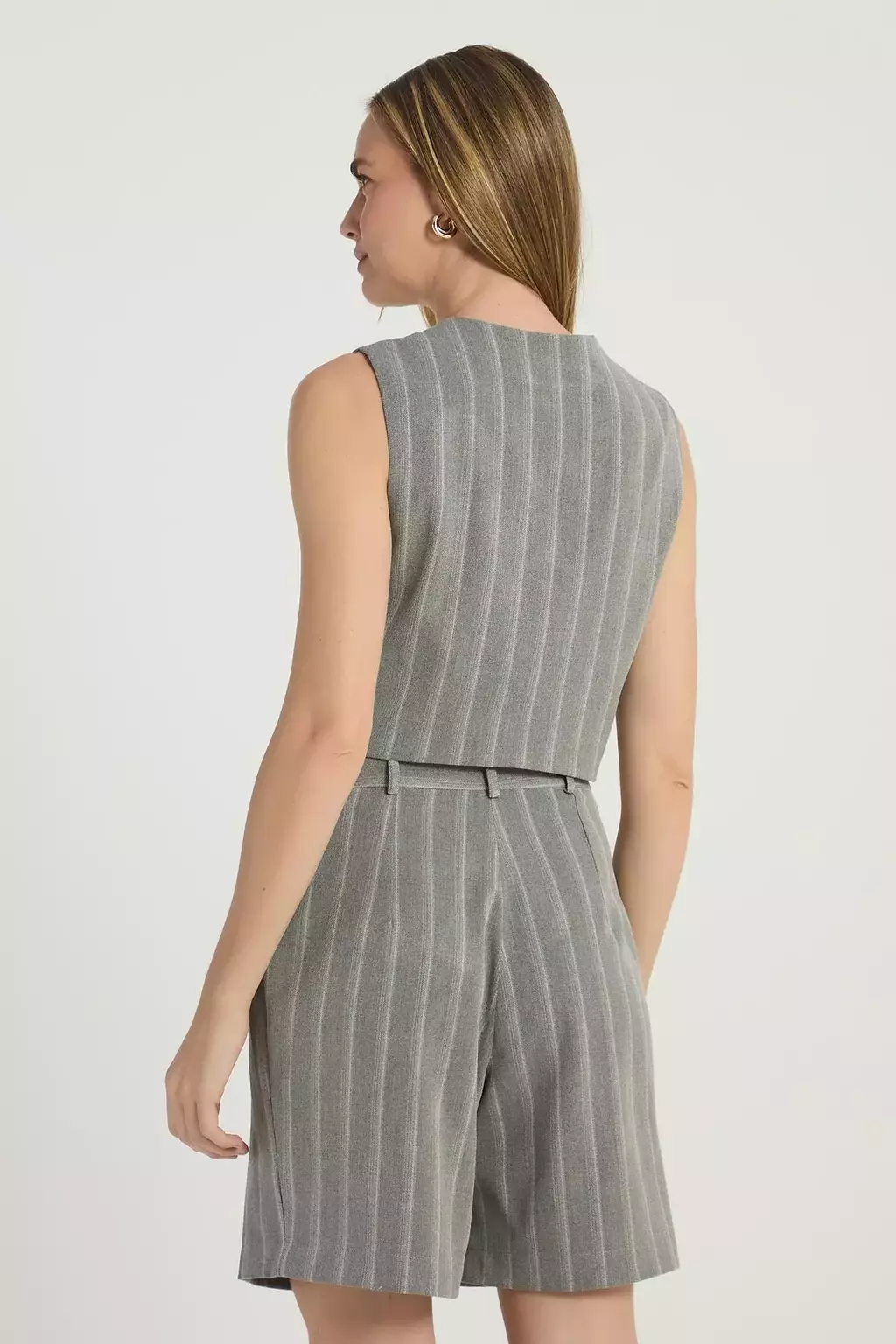 A Bermuda listrada conta com bolsos laterais, pregas frontais, fechamento por colchetes e zíper e espaço para passantes. Bermudas são opções estilosas para quem busca um look com personalidade e frescor sem perder a elegância.