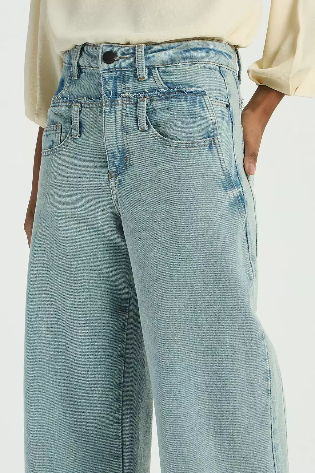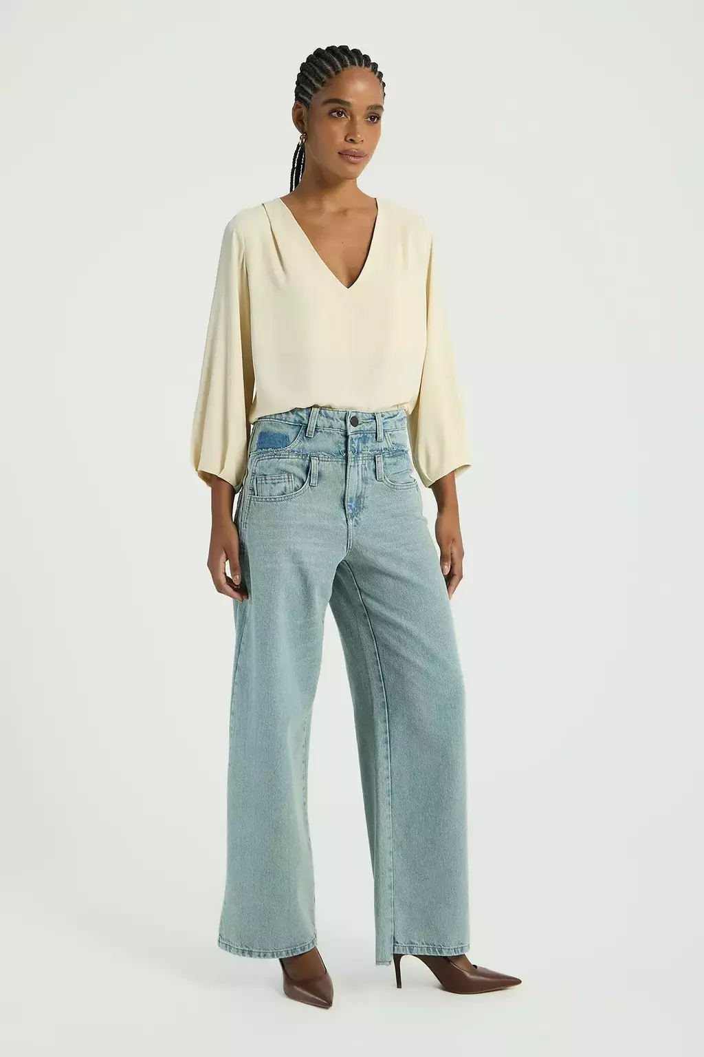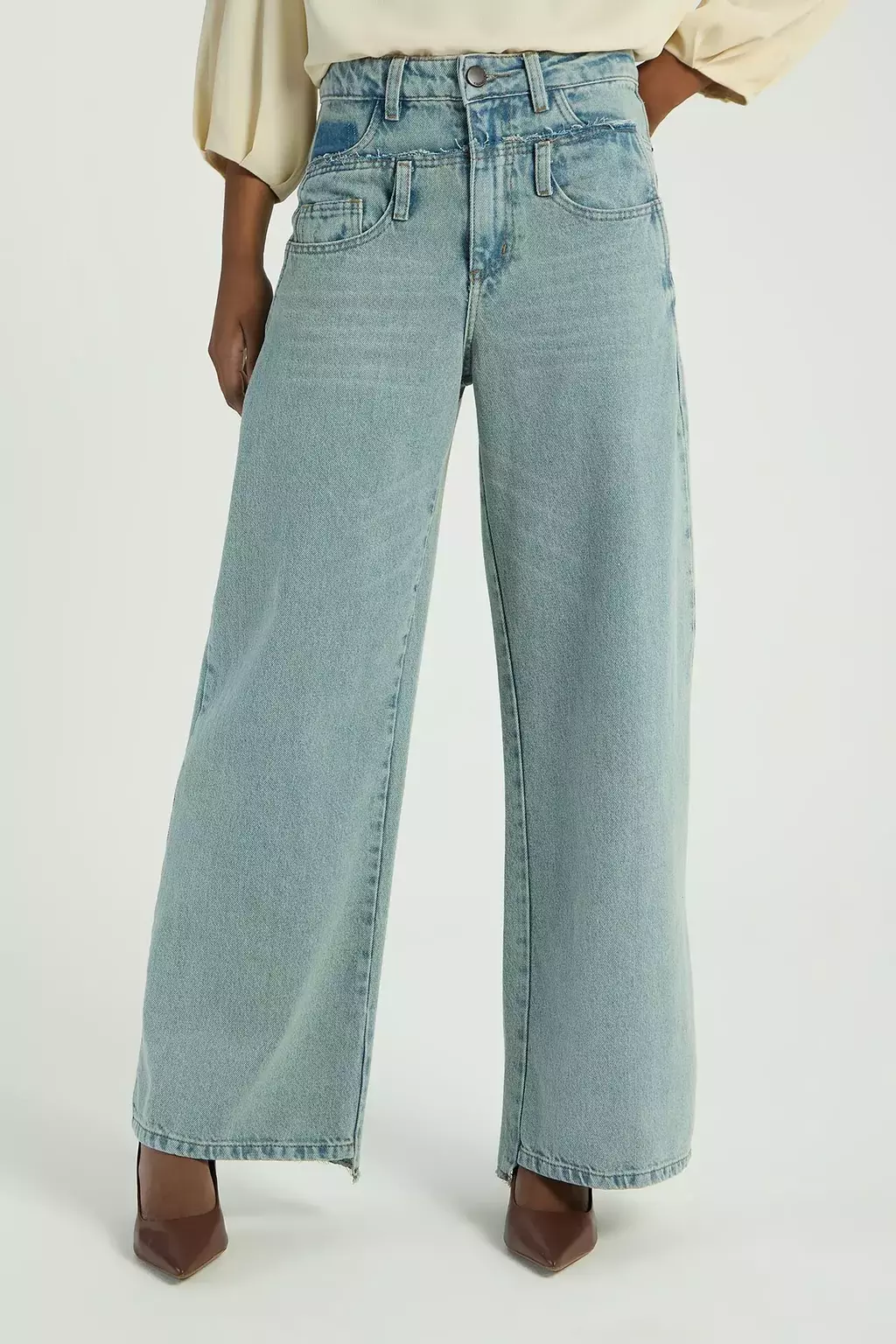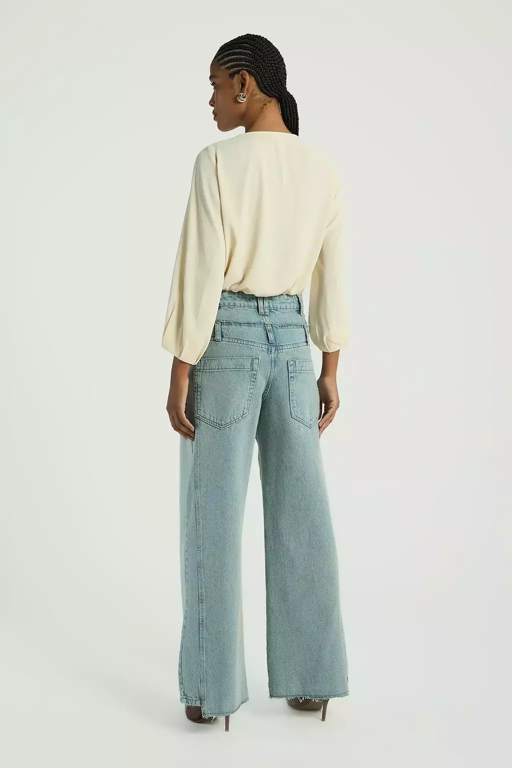A Calça jeans, de lavagem clara, apresenta modelagem reta, bolsos duplos laterais, bolsos traseiros, recortes no cós e espaços duplos para passantes. Um trend da estação que traz modernidade e ousadia ao seu look.