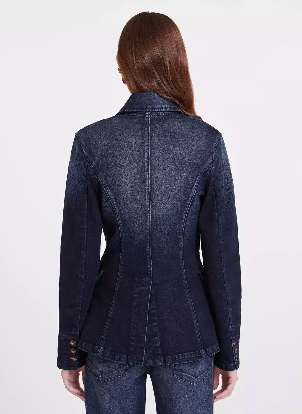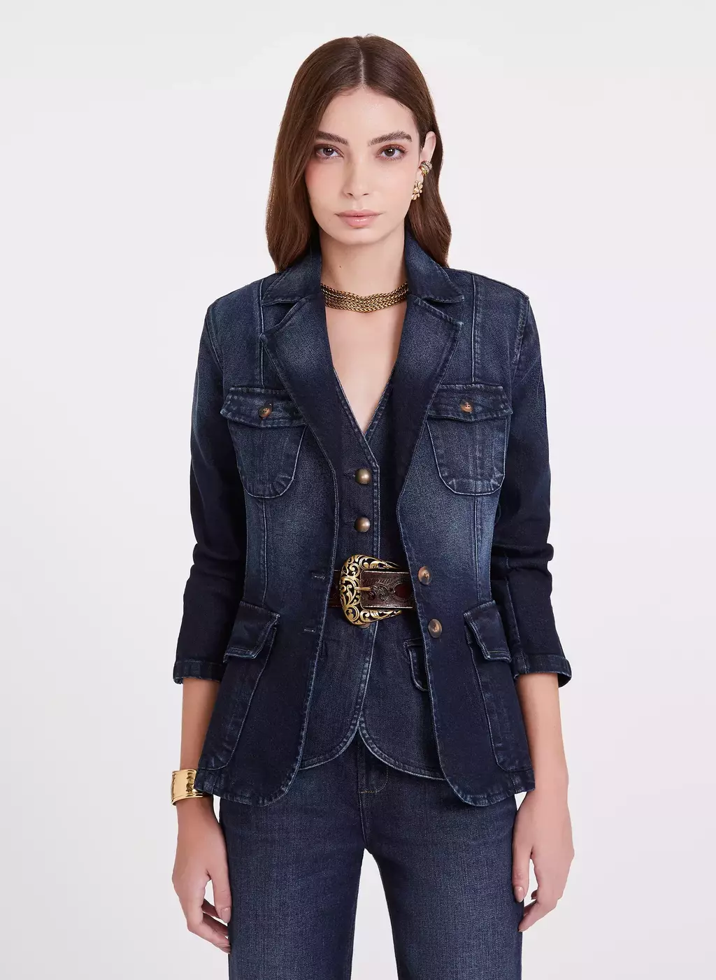 Seu corte estruturado adiciona sofisticação, enquanto o tom escuro oferece um toque de versatilidade e elegância. Combine com acessórios, colete, calça e finalize com scarpin, para um look all jeans irresistível.