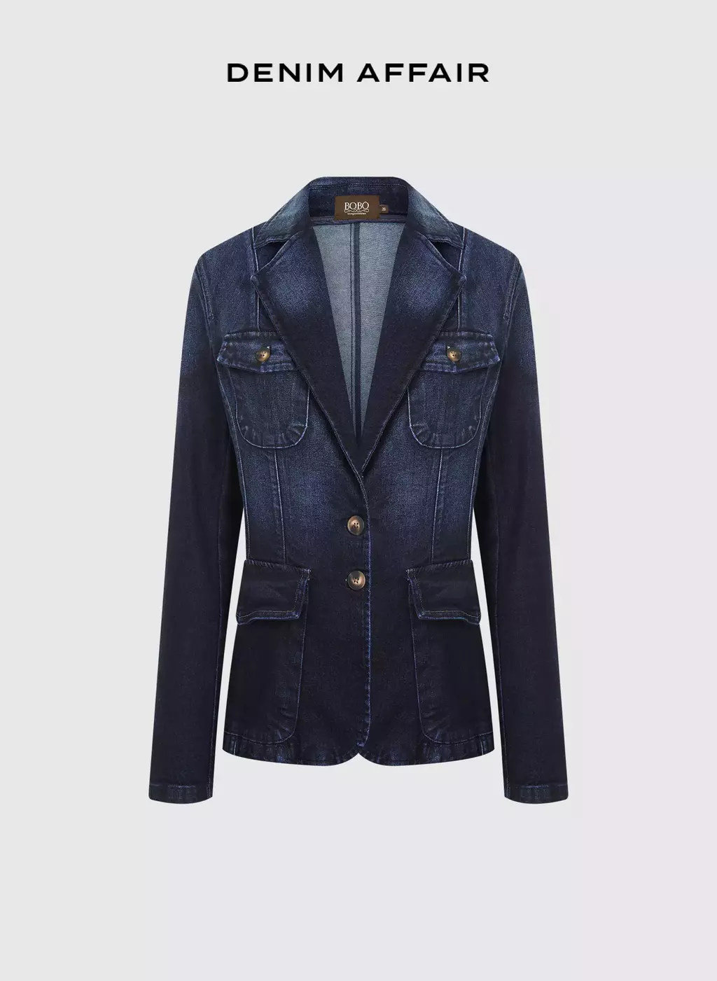 O Blazer é confeccionado em jeans, possui lavagem escura, caimento reto, gola com colarinho, lapela notched, mangas longas com abotoamento nos punhos, quatro bolsos frontais com lapela, ombreiras internas, fechamento frontal por botões e acabamento pespontado.