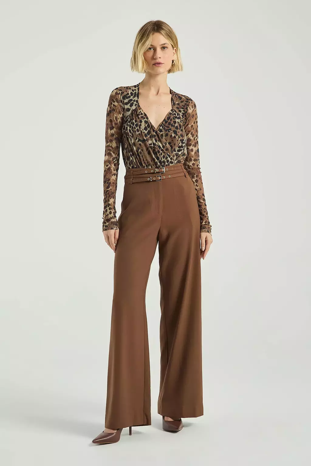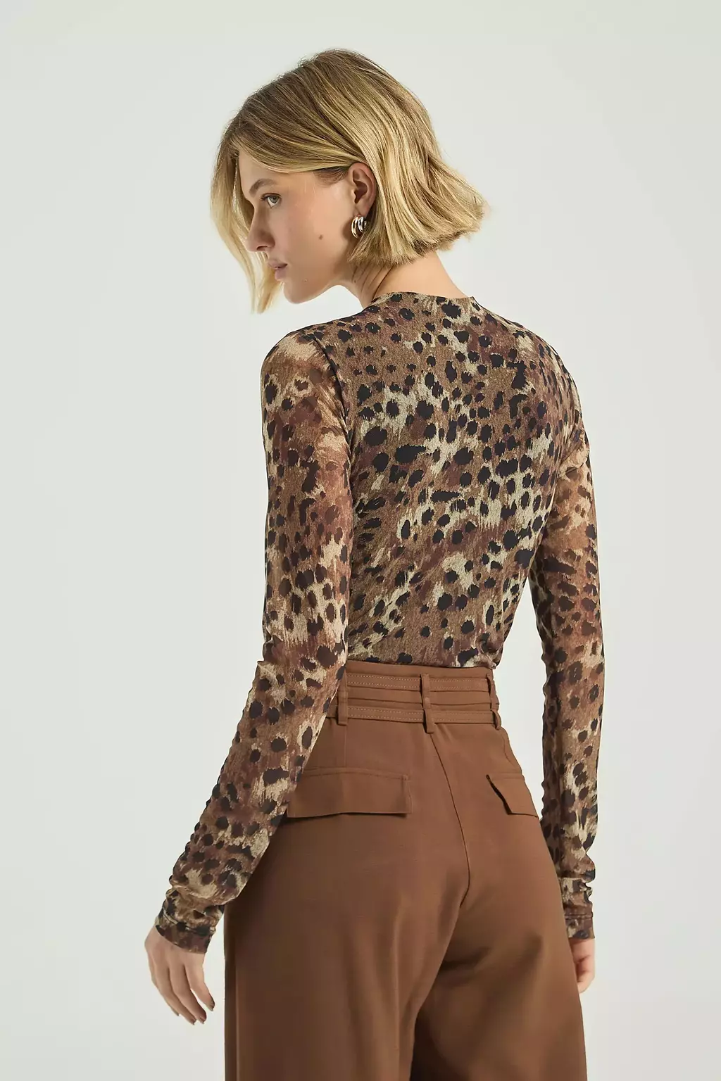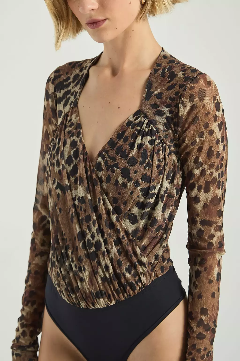 O Body estampado, confeccionado em tule, possui decote em V transpassado, franzimentos frontais, mangas longas e modelo justo ao corpo. Combine o body com peças neutras, equilibrando a estampa com elegância.