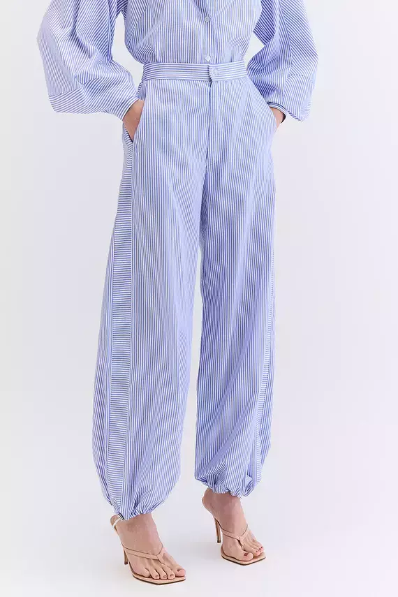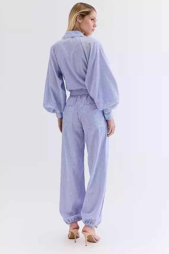 CALÇA DE TRICOLINE DE ALGODÃO COM TOQUE ACETINADO, MODELAGEM JOGGER COM REGULADOR AJUSTÁVEL NA BARRA.