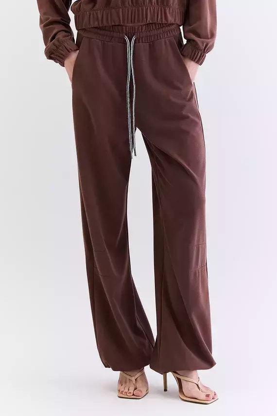 CALÇA DE MALHA, MODELAGEM JOGGER, COM AJUSTE NA BARRA, CÓS DE ELÁSTICO E CORDÃO DE RETÍLINEA PARA AJUSTAR, RECORTES NA LATERAL E BOLSO.