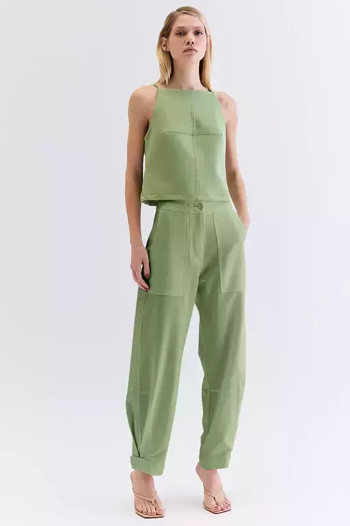 CALÇA DE TECIDO PLANO,COM BOTÃO FORRADO NO CÓS E NA BARRA, COM MODELAGEM SLOUCHY.
