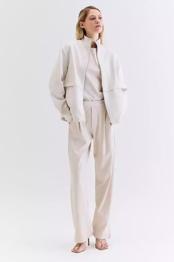 CASACO DE MALHA, ENTRETELADO E FORRADO, MODELAGEM OVERSIZED, COM ZÍPER NO FECHAMENTO E BOTÃO NO PUNHO.