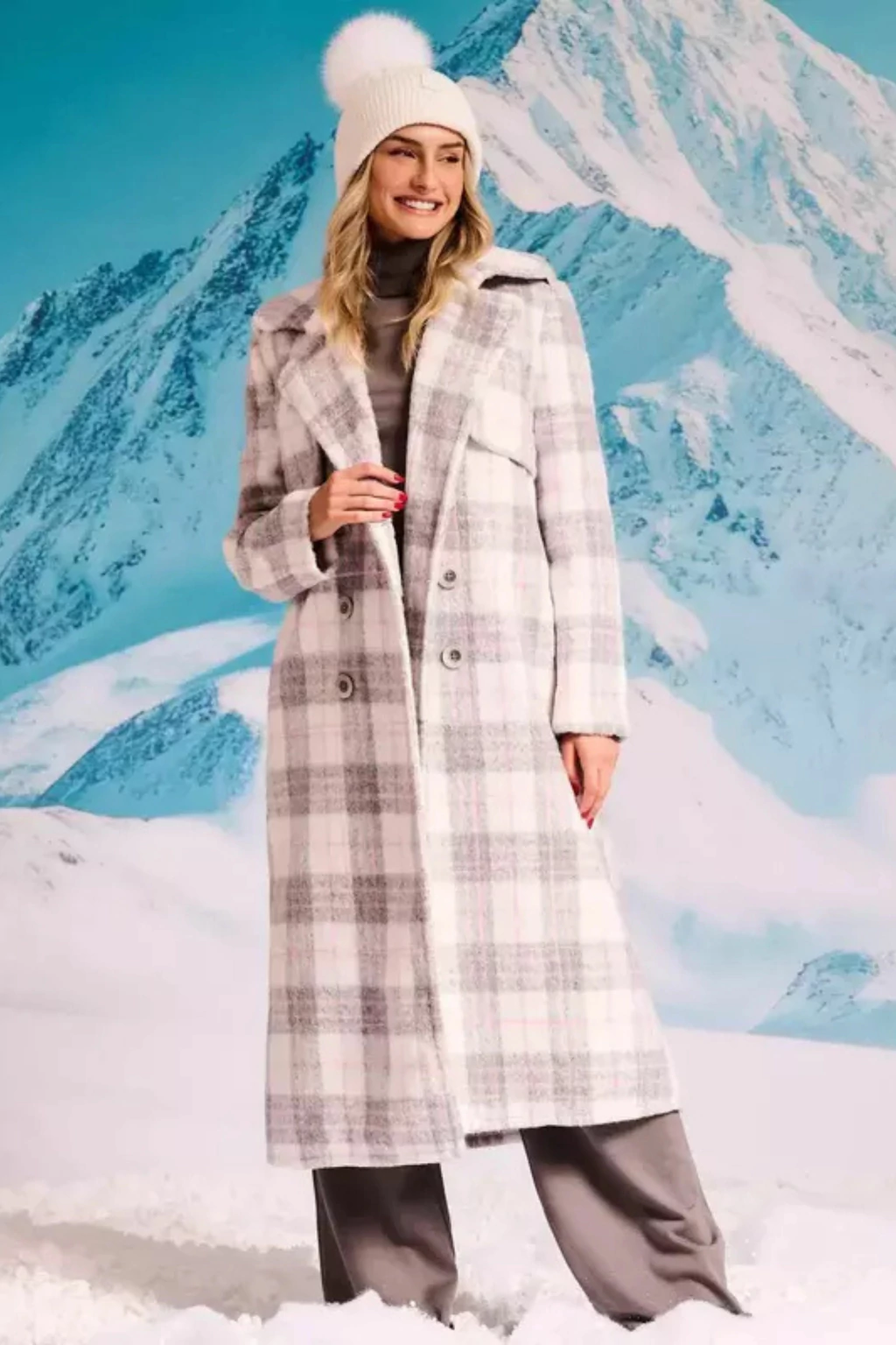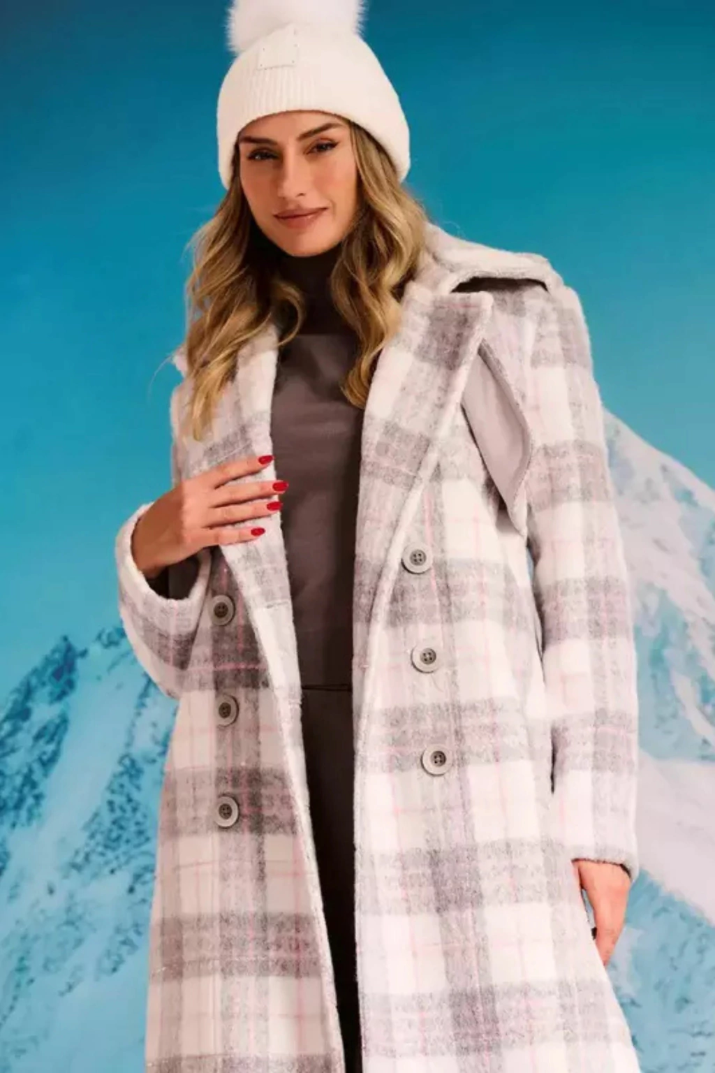 Trench Coat Xadrez,Anne Fernandes. Trench Coat alongado, modelo com mangas longas, gola e pala, possuí um xadrez discreto em tons de rosa e cinza, e tem complementando as listras do xadrez um bordado de micro paetês translúcidos, que dão um leve brilho à peça. Não acompanha outras peças.