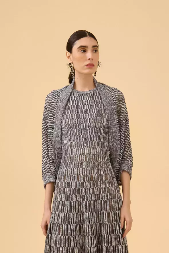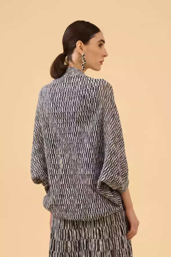 O Casulo Ponto Geométrico Mescla com Transparência em Tricot é uma peça única e moderna, com uma combinação de pontos geométricos e detalhes transparentes que trazem sofisticação ao visual. Seu design fluido e o tricot macio garantem conforto e estilo. Ideal para looks ousados e contemporâneos, perfeitos para diversas ocasiões.