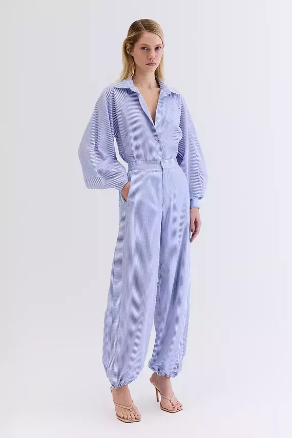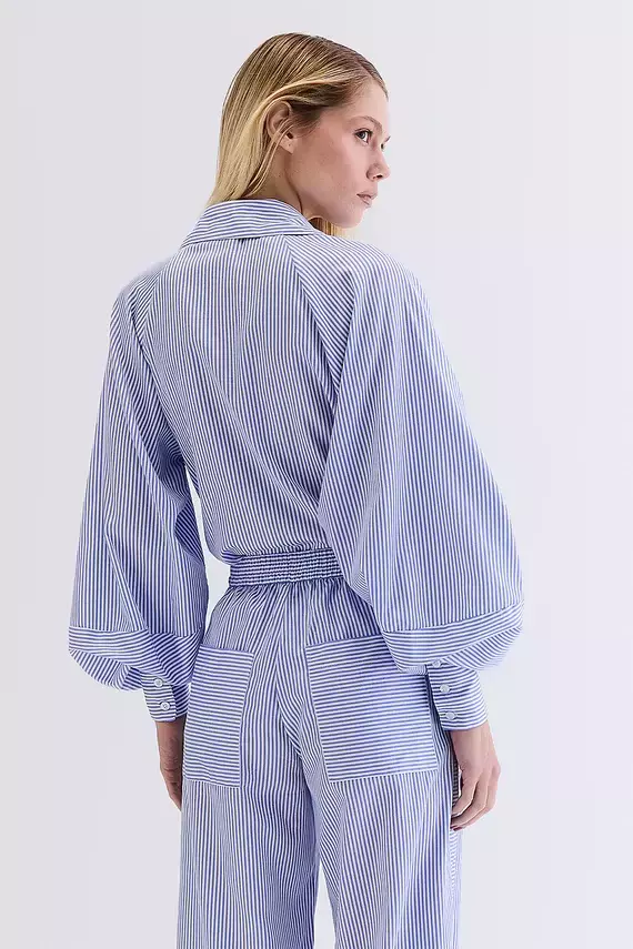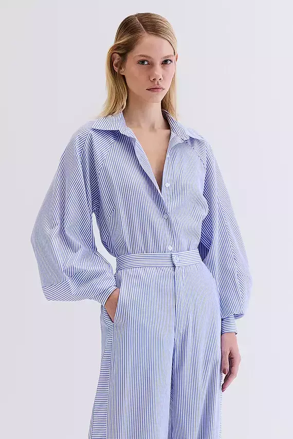 CAMISA DE TRICOLINE DE ALGODÃO COM TOQUE ACETINADO, MANGA BUFANTE E CORPO RETO.