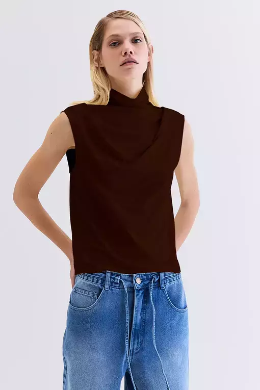 REGATA DE MALHA COM DEGAGÊ NA GOLA, CAIMENTO RETO E COMPRIMENTO REGULAR.