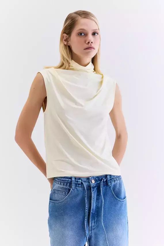 REGATA DE MALHA COM DEGAGÊ NA GOLA, CAIMENTO RETO E COMPRIMENTO REGULAR.