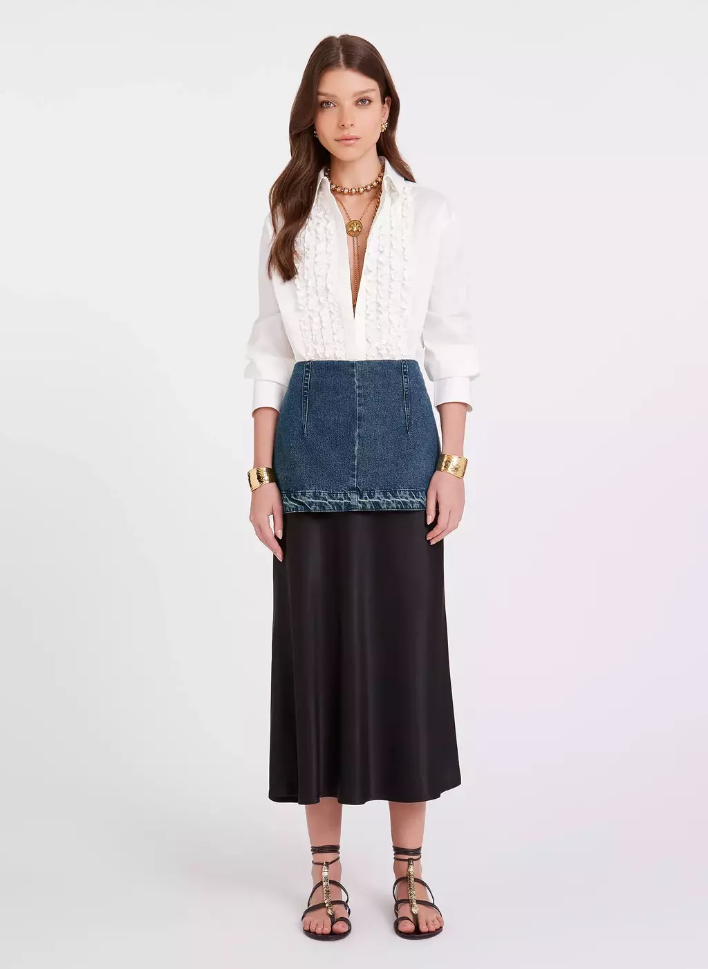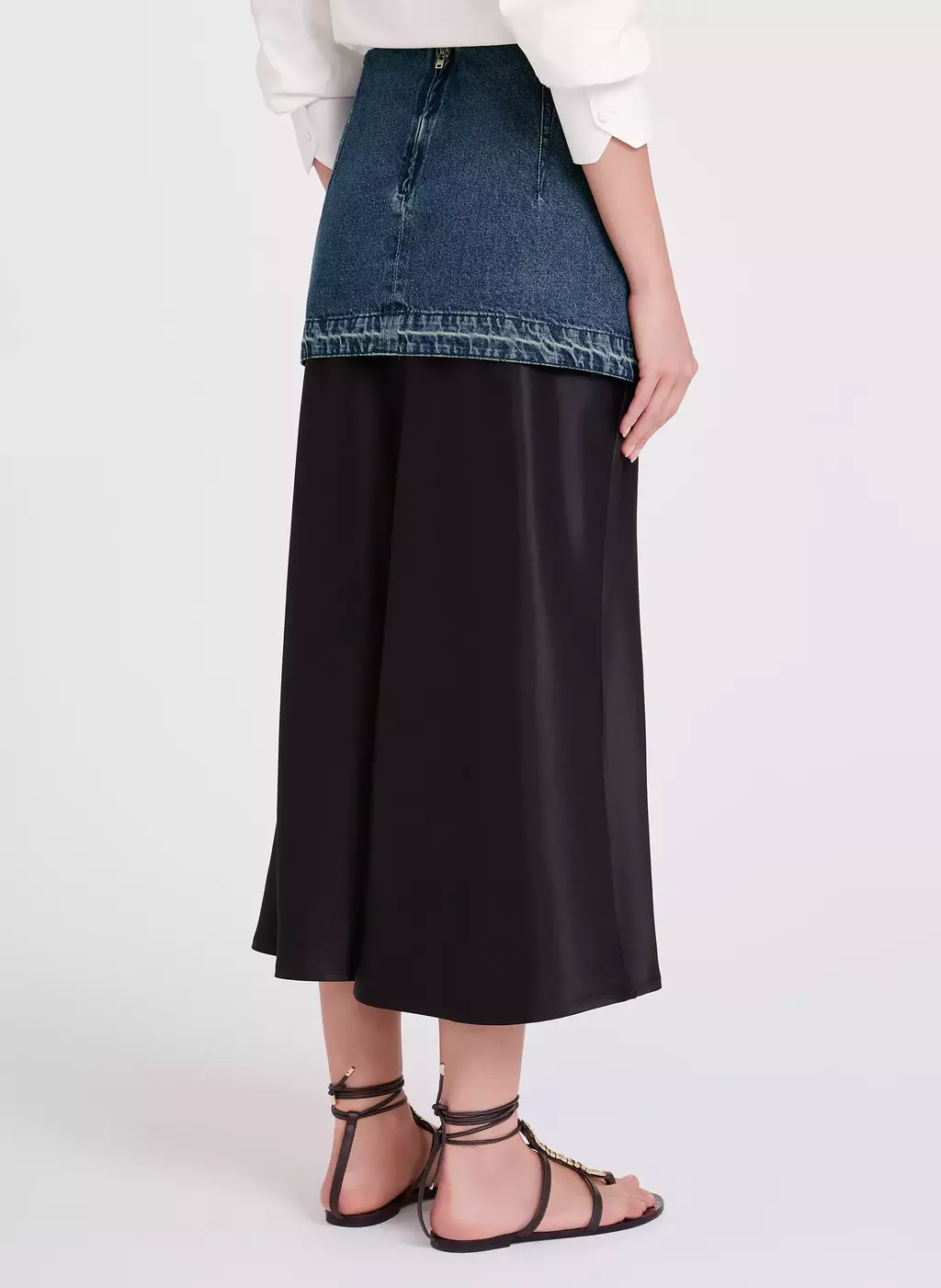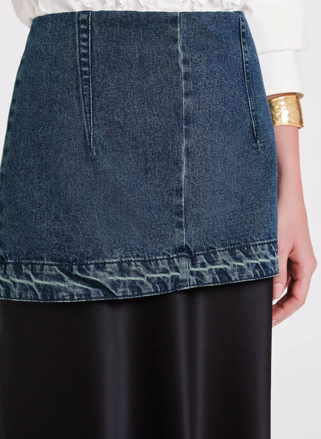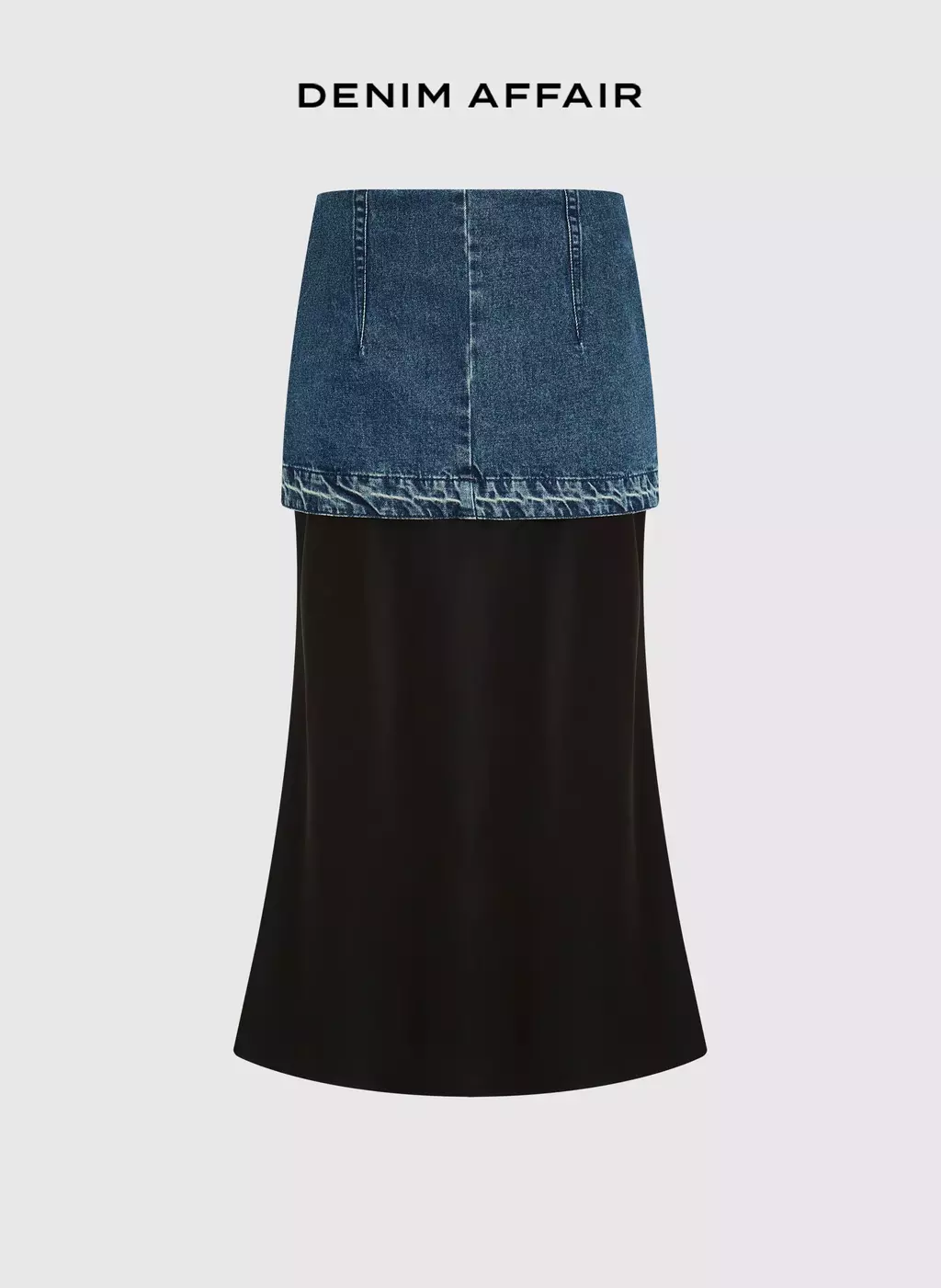 A Saia é confeccionada em jeans, possui lavagem média, possui caimento reto, detalhes frontais pespontados, fechamento posterior por zíper, forro interno, comprimento midi e acabamento pespontado.