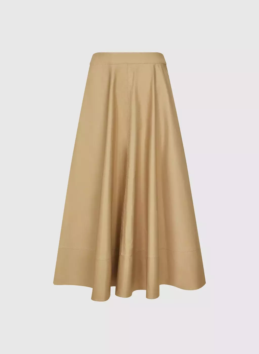 A Saia é confeccionada em algodão alfaiatado, possui modelagem em alfaiataria, corte godê, modelagem evasê, dois bolsos tipo faca, comprimento midi, fechamento traseiro por zíper de metal e acabamento pespontado.