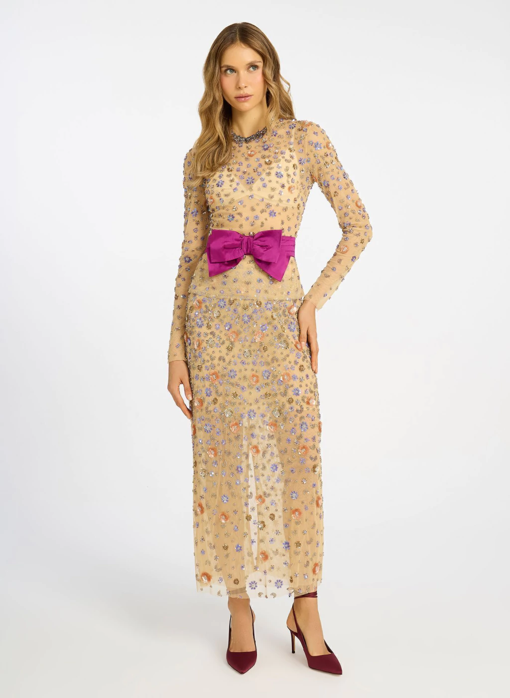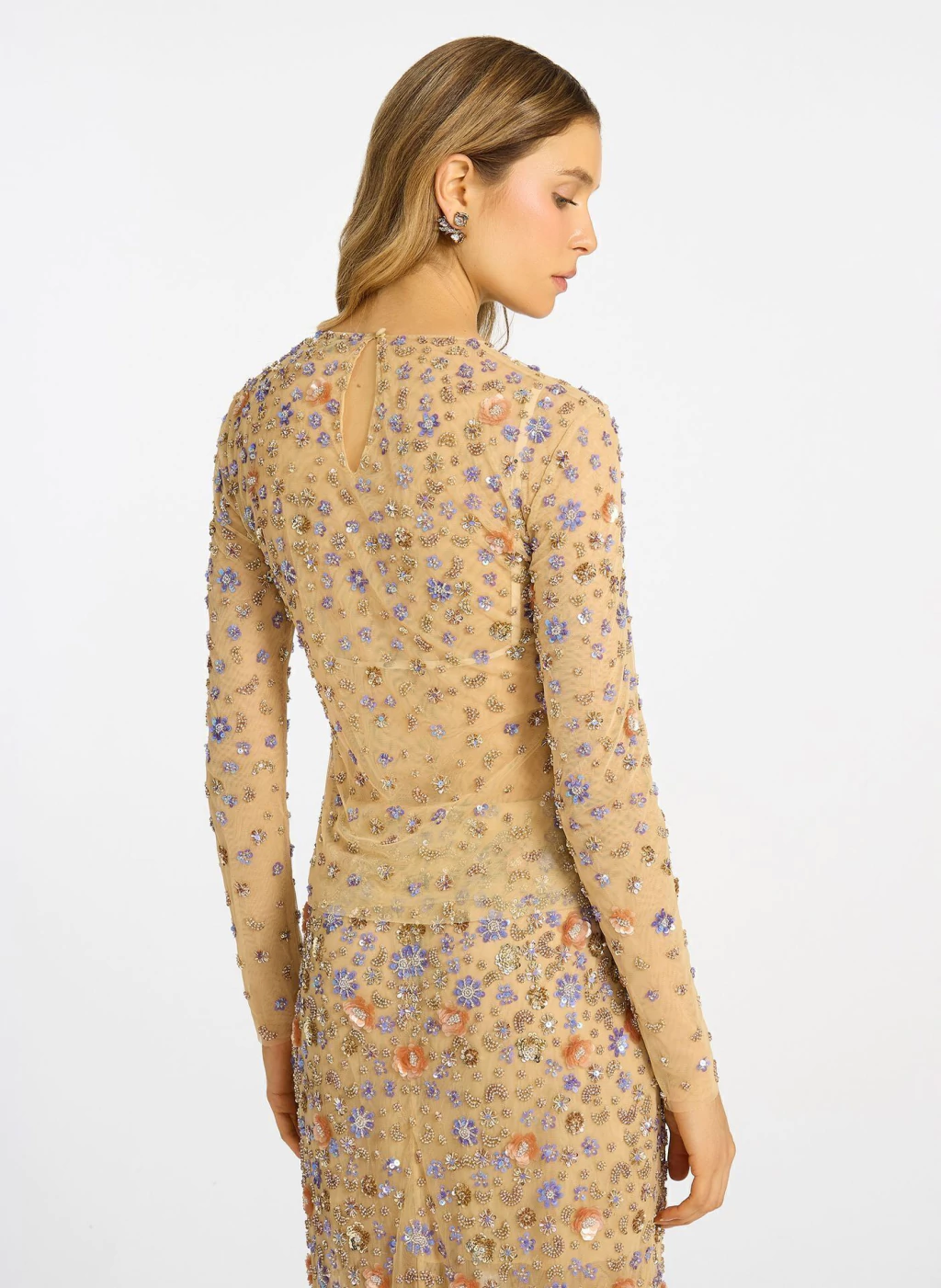 Os bordados florais garantem uma estética romântica e cheia de charme para sua produção. Experimente a Blusa Temps com acessórios e complemente com scarpin, para um visual que une feminilidade e originalidade. A Blusa é confeccionado em malha tule bordada com pedrarias, possui transparência, decote redondo, mangas longas, recorte posterior com fechamento por botão e acabamento pespontado. Composição: 100% Nylon