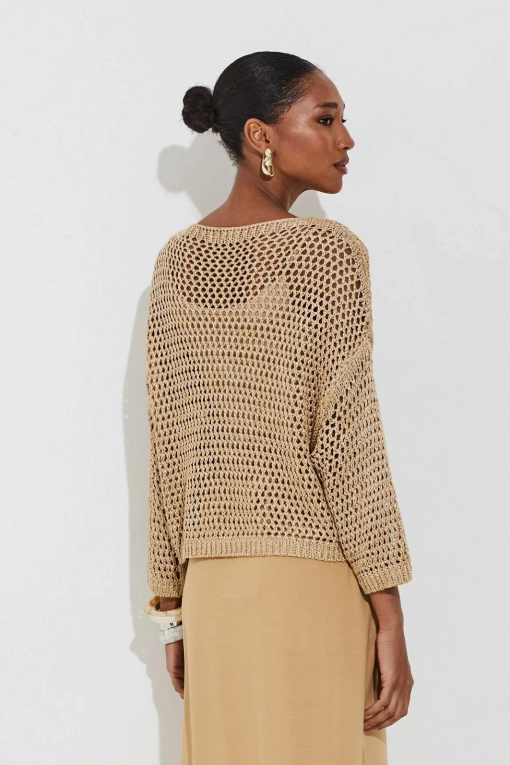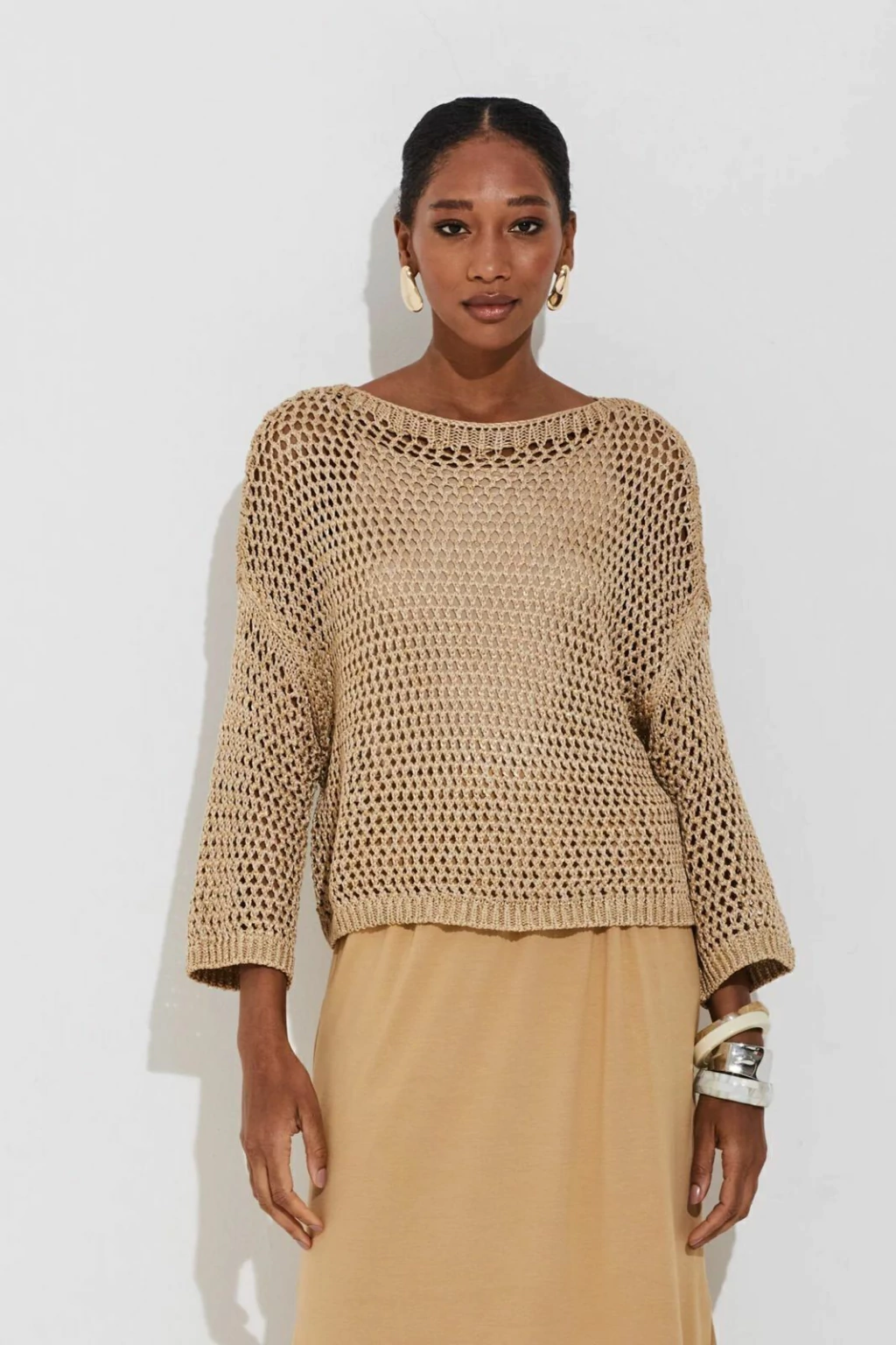 Blusa em tricot telado com fio torcido e leve brilho acetinado, que adiciona sofisticação ao visual. Possui gola canoa, ombros deslocados e mangas 7/8, criando uma silhueta moderna e confortável. Com comprimento regular e ponto mais aberto, é ideal como sobreposição em produções elegantes e pode ser usado até como saída de praia.