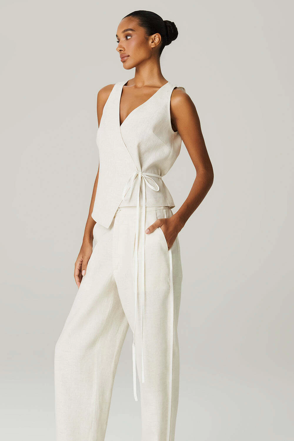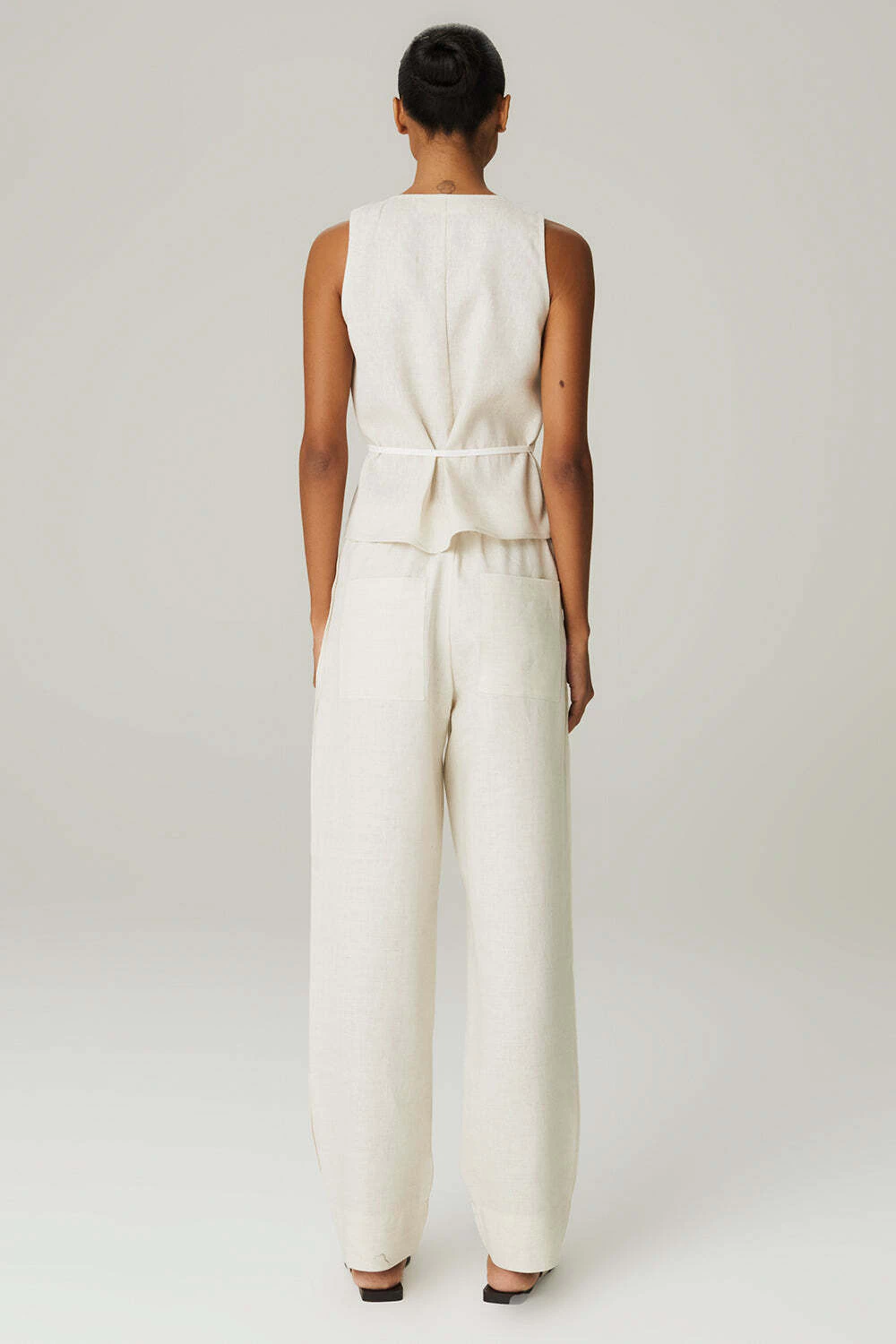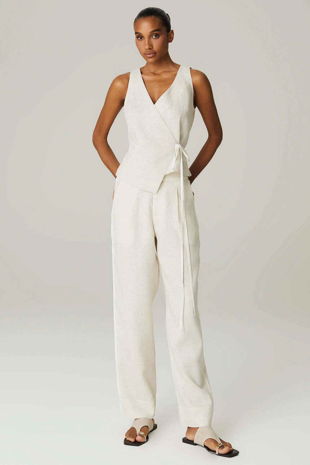 CALÇA DE LINHO MODELAGEM RETA, COM CÓS DE ELÁSTICONAS COSTAS E VIVO BICOLOR NA LATERAL.