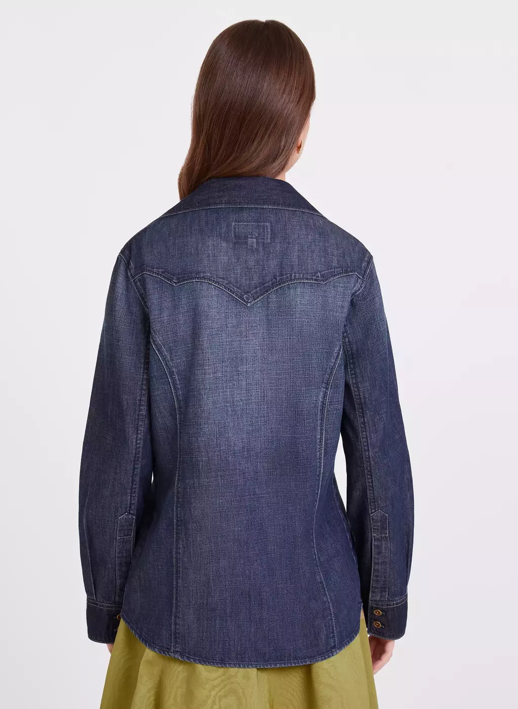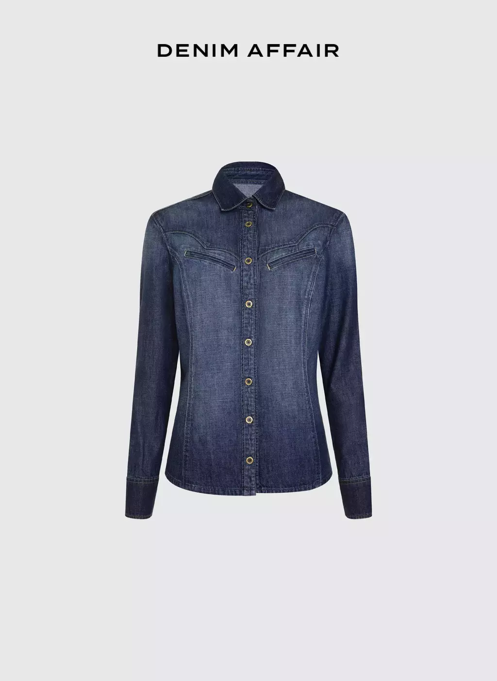 A Camisa é confeccionada em jeans, possui lavagem média, caimento reto, gola com colarinho, mangas longas com abotoamento nos punhos, dois bolsos frontais embutidos, fechamento frontal por botões, barra posterior levemente alongada e acabamento pespontado.
