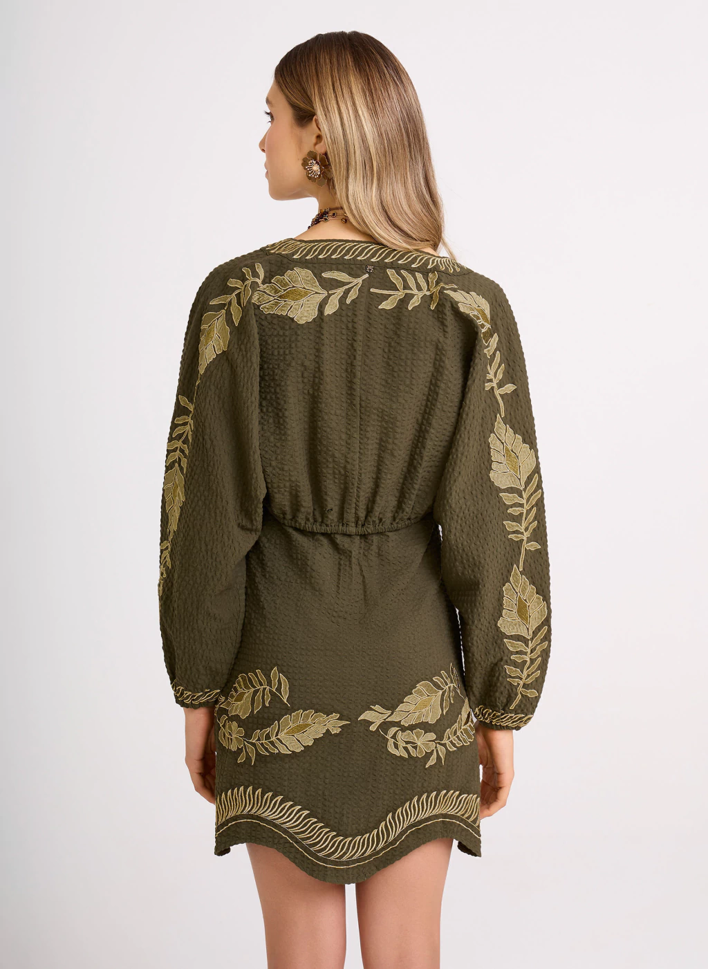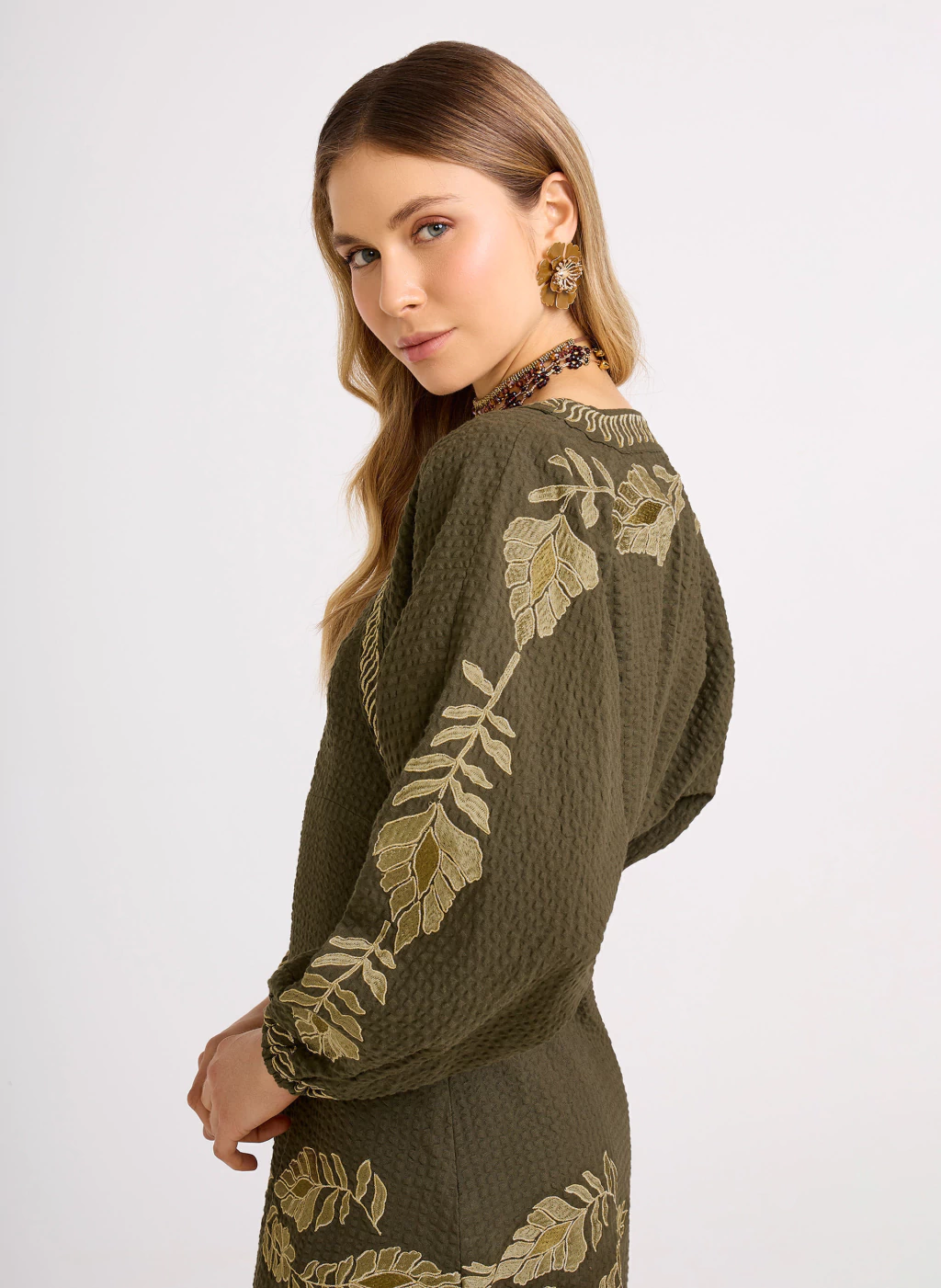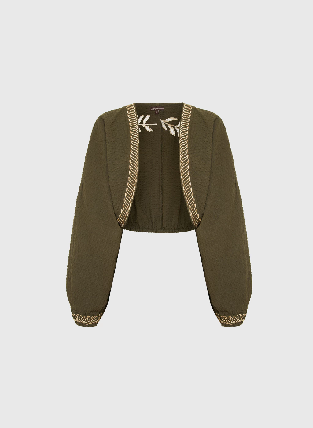 O Casaco é confeccionada em tecido plano texturizado, possui bordado maquinetado com fios de lurex, modelo bolero, mangas longas bufantes e não possui fechamento.