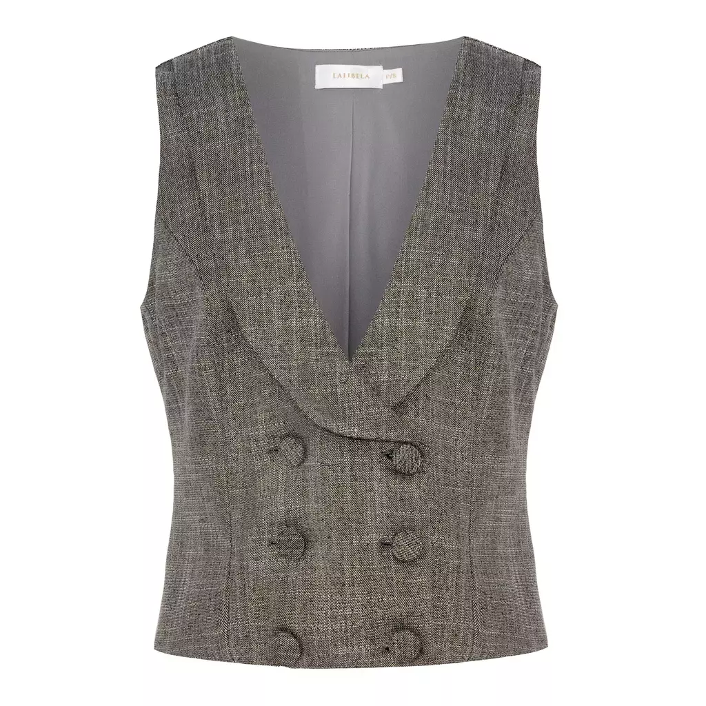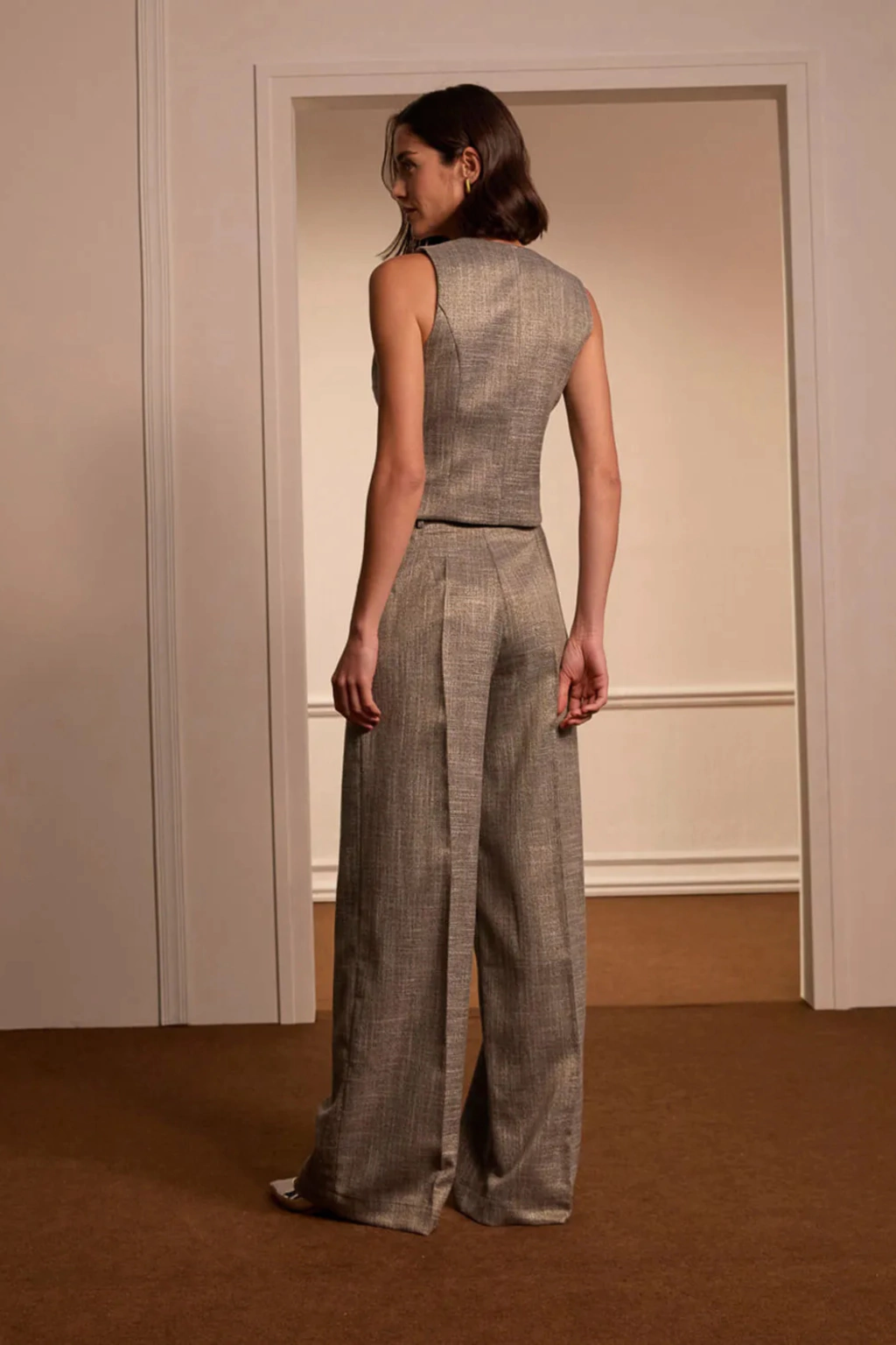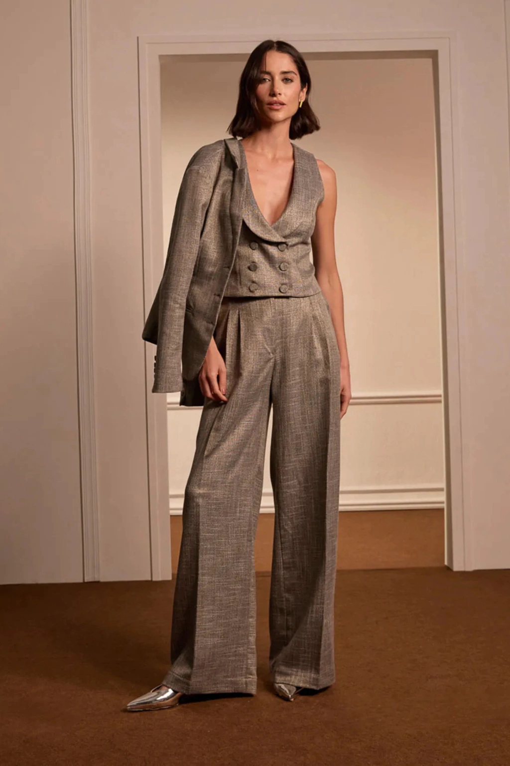 O Colete Imelda é uma peça elegante e atemporal, ideal para composições sofisticadas. Sua gola smoking e fechamento cruzado com botões forrados especiais elevam o design, tornando-o um item chave para looks refinados. Confeccionado em 67% poliéster, 31% viscose e 2% elastano, o tecido estruturado oferece caimento impecável, enquanto os pontos de brilho na trama proporcionam um toque sofisticado e moderno. Perfeito para combinar com saias e calças em alfaiataria.