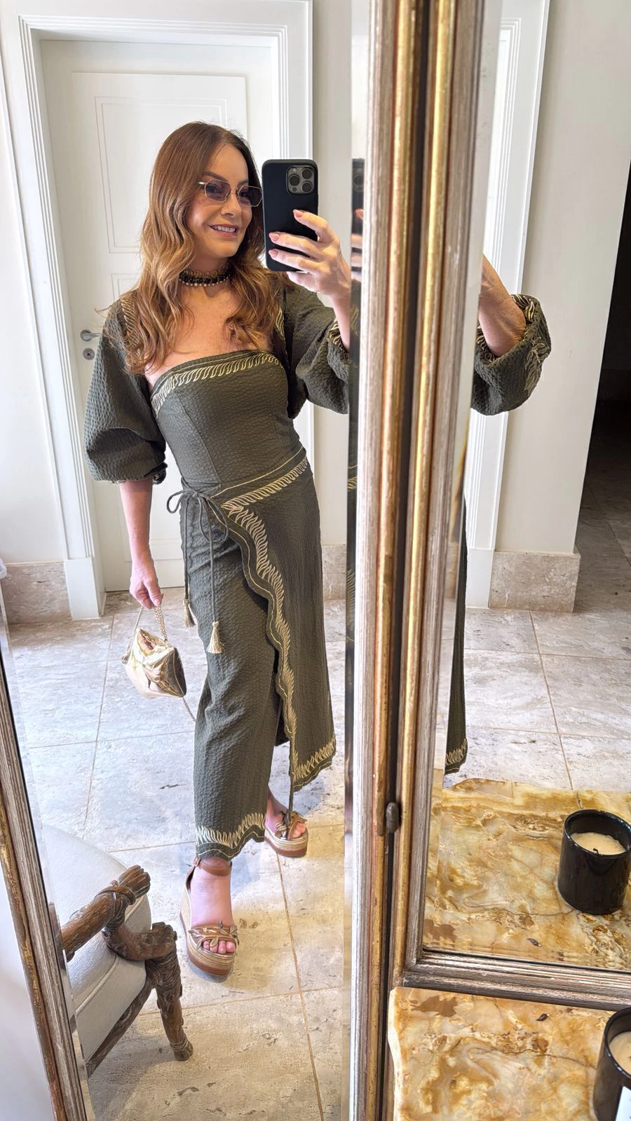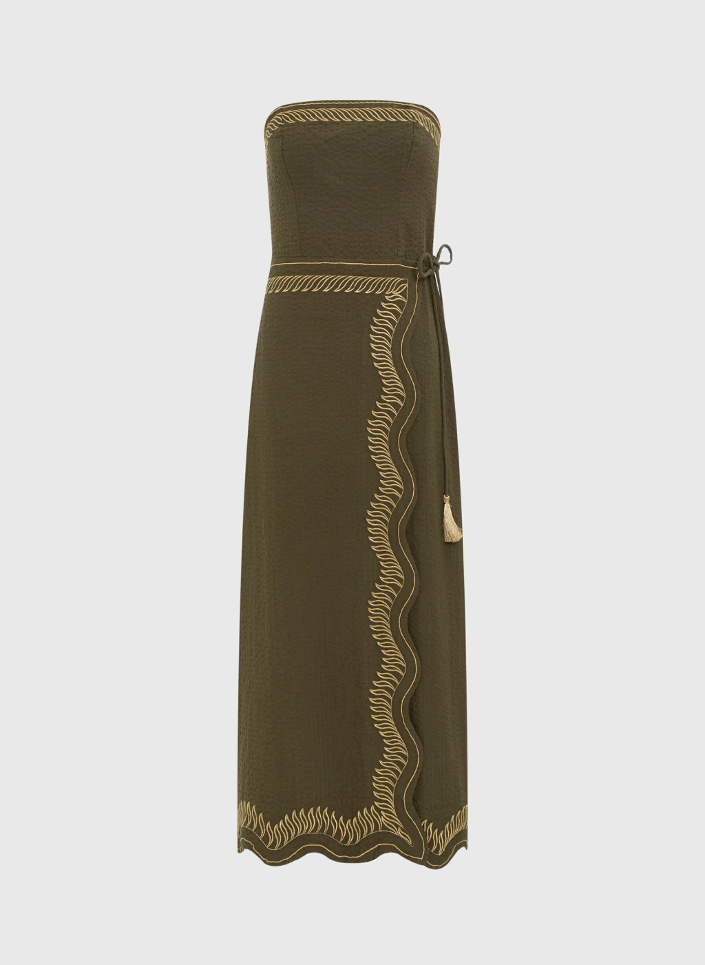 O Vestido é confeccionado em tecido plano texturizado, possui bordado maquinetado com fios de lurex, caimento reto, decote tomara que caia, cordão para amarração na cintura com ponteira de tassel, lastex posterior, barra com ondulação, comprimento midi e acabamento pespontado.