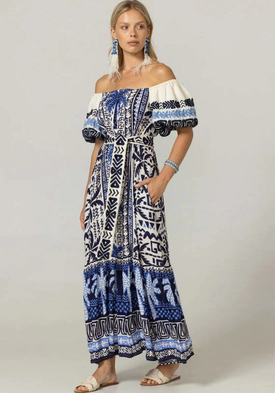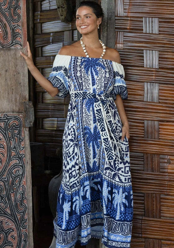 Apresentamos o Vestido Maxi Mya da Miss June Paris. Esta peça boêmia e chique exibe estampas astecas e de palmeiras em tons de azul, branco e preto, oferecendo um estilo elegante e único para a mulher moderna. Meticulosamente confeccionado com técnicas tradicionais, este vestido esbanja qualidade e sofisticação.